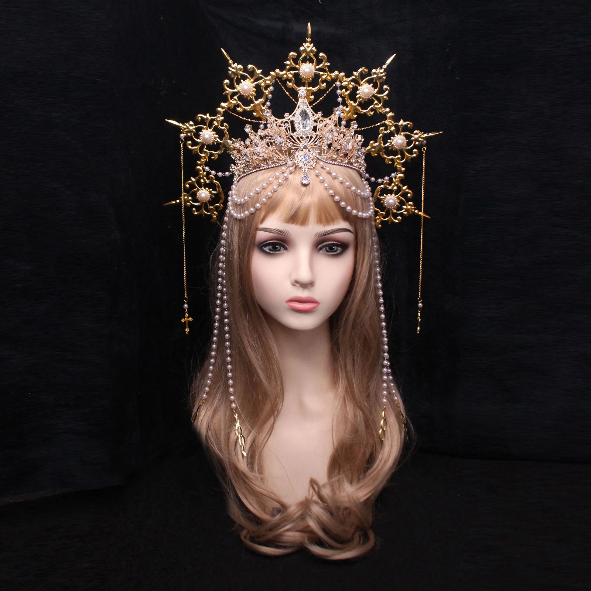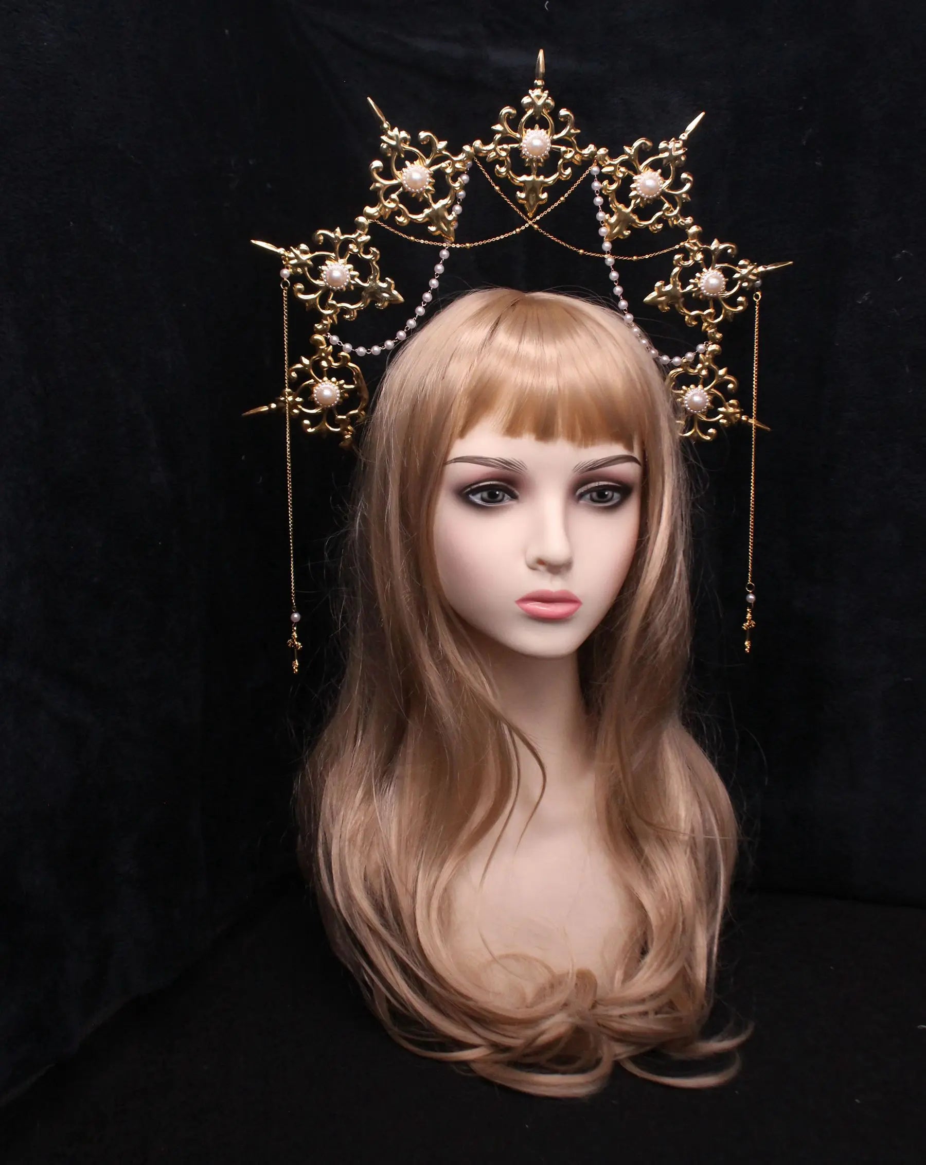 Una joya celestial para cabelleras divinas. Esta corona tipo halo dorado con pinchos y cadenas es un tributo al poder solar que llevas dentro.