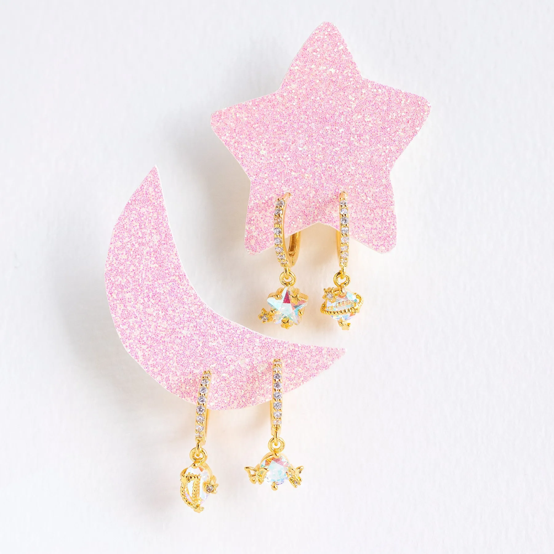 Lleva el cielo nocturno contigo. Estos pendientes dorados bañados en oro 18k son como constelaciones atrapadas en movimiento: lunas misteriosas, planetas vintage y estrellitas que titilan con cada paso que das.