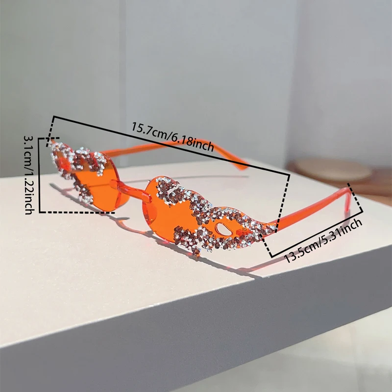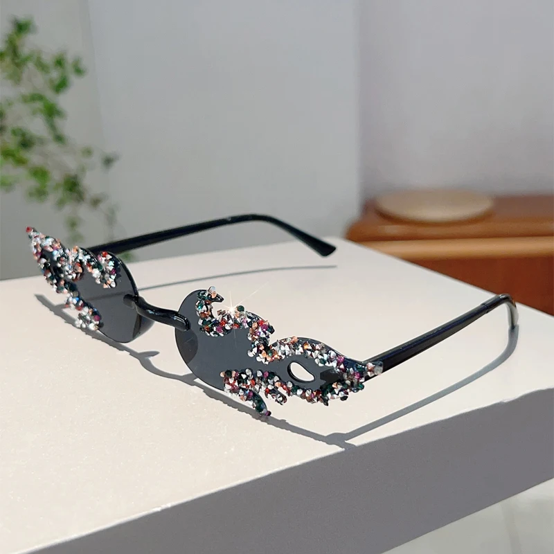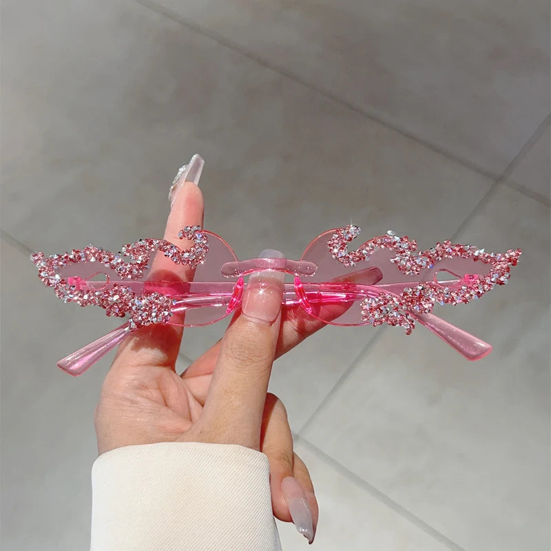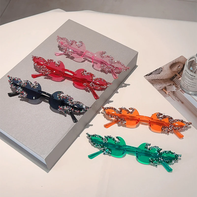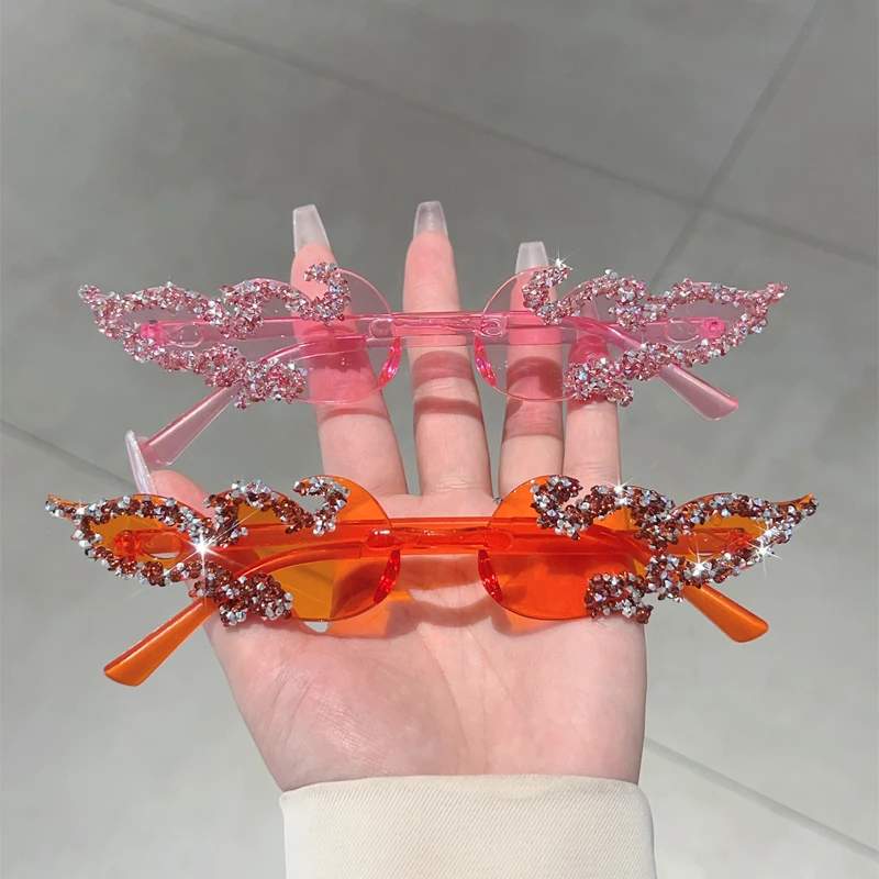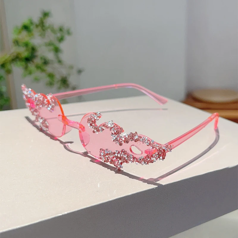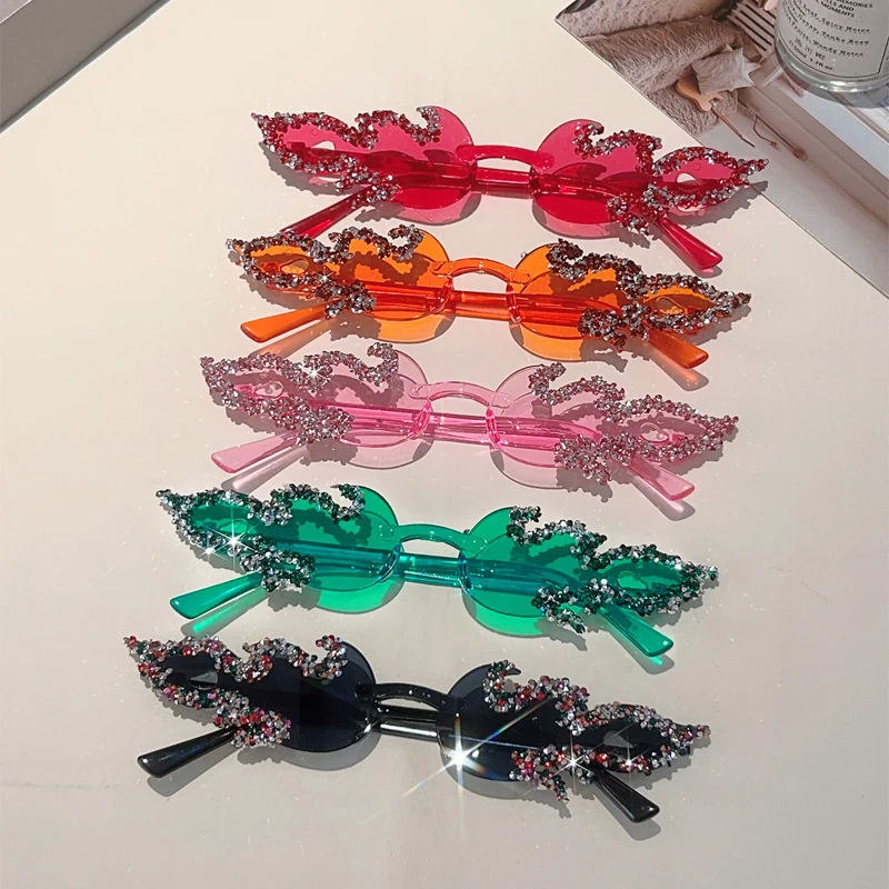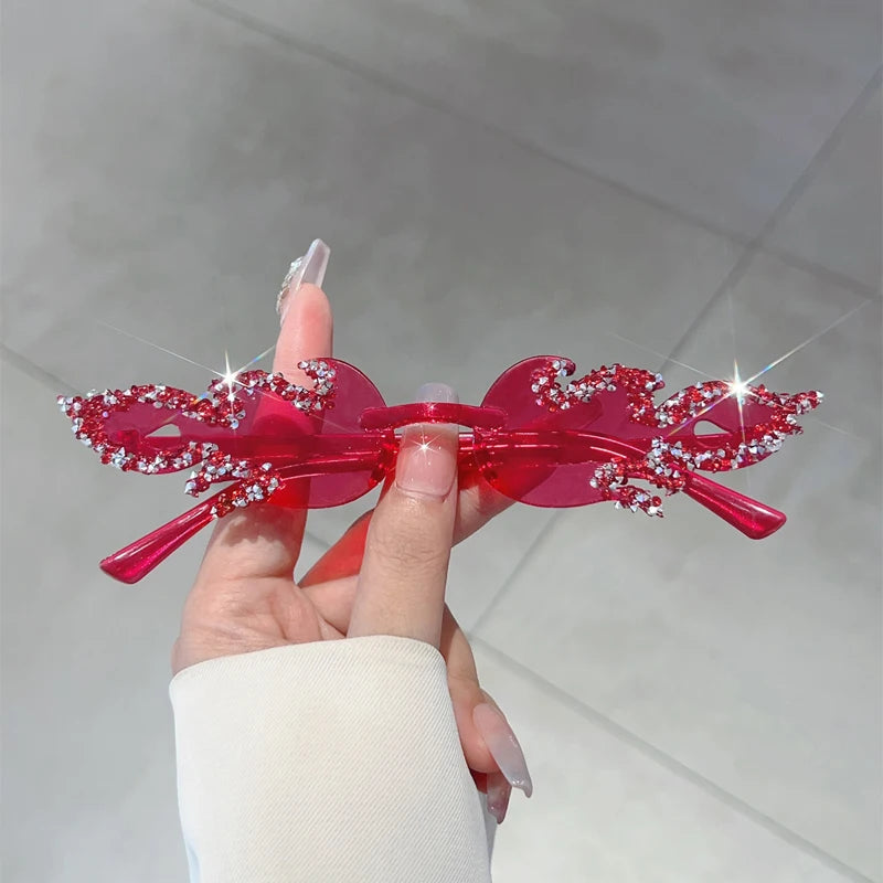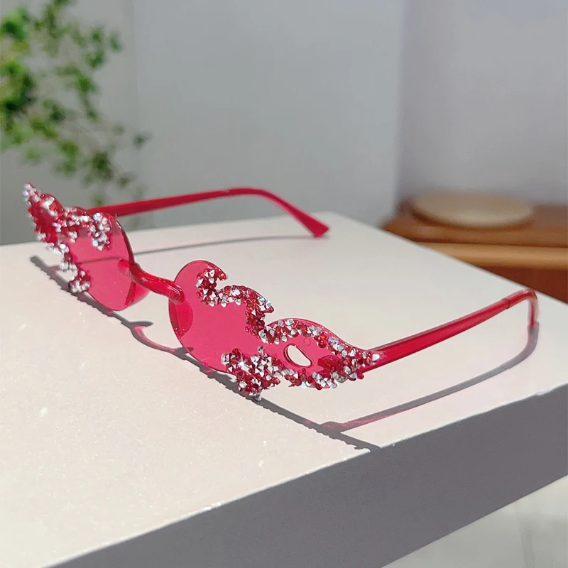 Las FireGlam Shades te convierten en chispa viva: sin montura, con cristales en forma de flamas, y ese brillo candy color que transforma cada mirada en puro deseo.