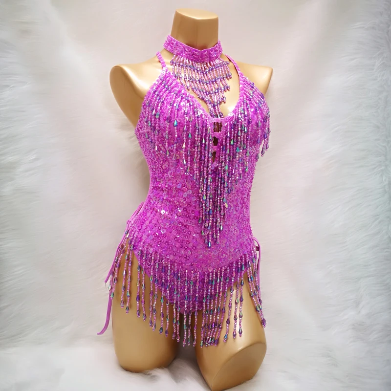 Confeccionado en tejido de malla con pedrería fucsia de alto brillo, este cuerpo es un homenaje a las sirenas rebeldes que aman destacar. Su diseño con escote profundo, corte favorecedor y reflejos que capturan la luz te hará brillar en la pista, en el festival o bajo las estrellas.
