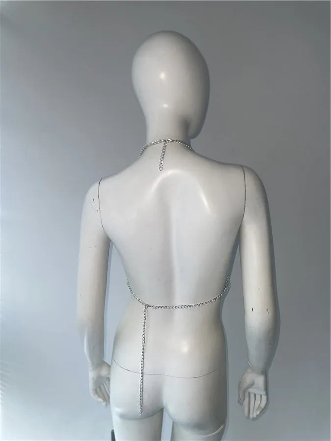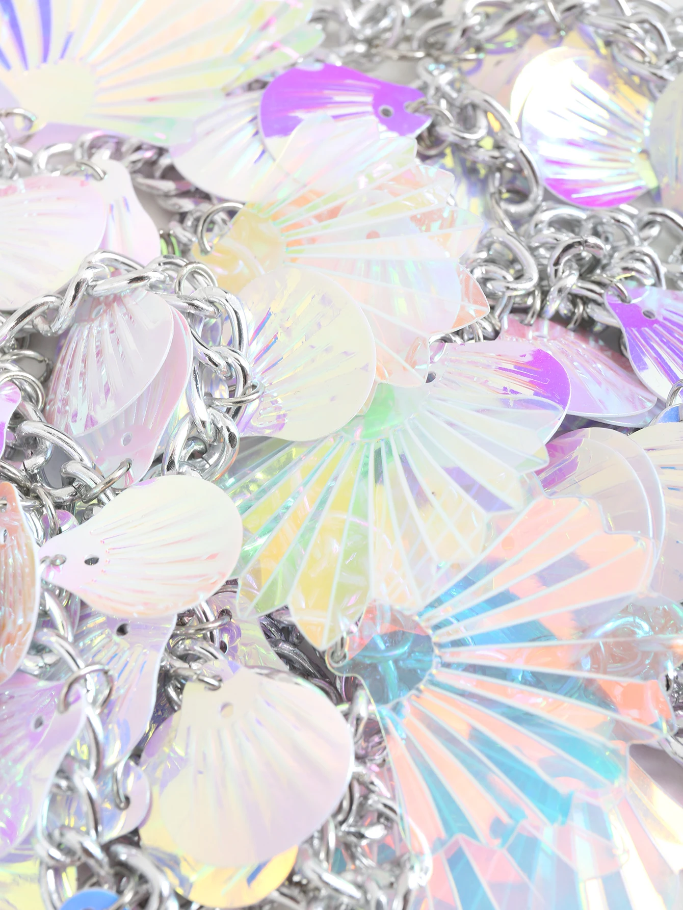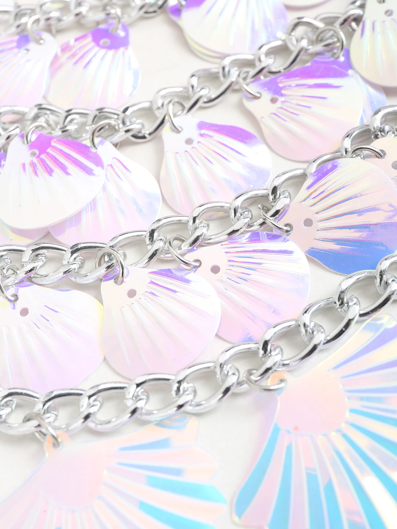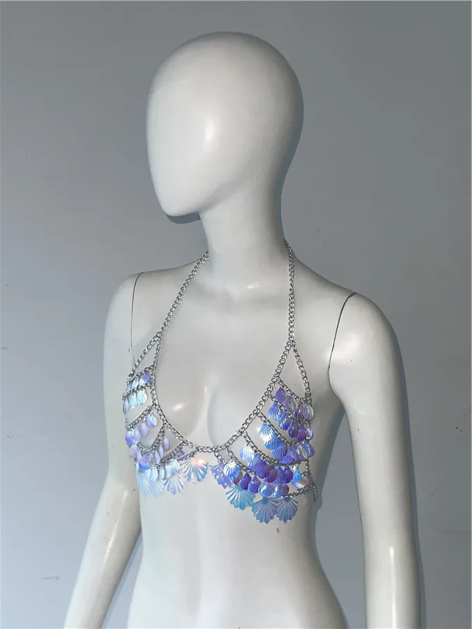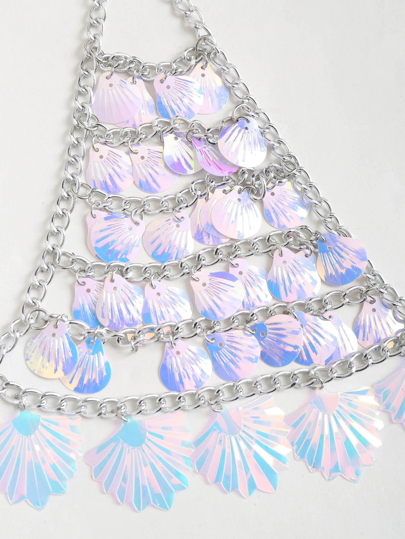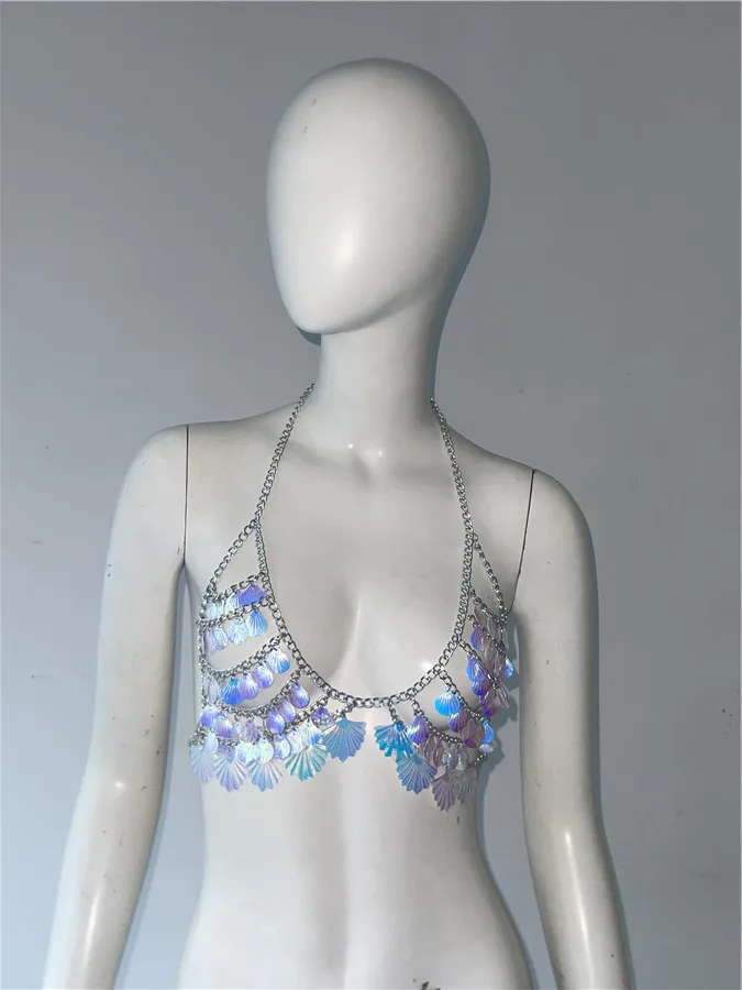 Este sujetador joya es una fantasía hecha realidad. Está confeccionado con cadenas plateadas y conchas brillantes que simulan el efecto tornasolado del nácar como si hubieras salido directamente de una rave submarina. Cada movimiento tuyo lo convierte en un espectáculo de luz y sensualidad.
