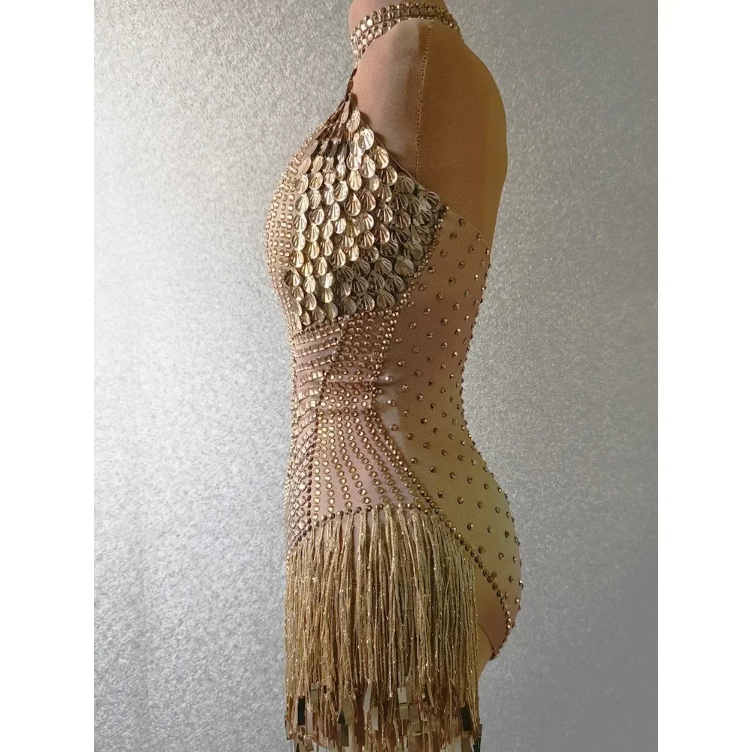 Conviértete en una diosa del desierto con este body dorado de ensueño 👑. Diseñado con red brillante, pedrería estratégica y flecos metálicos que se mueven contigo, es puro fuego para festivales, performances o looks de impacto. El escote halter profundo y los reflejos dorados elevan tu energía al máximo. Brilla como nunca bajo el sol o las luces del escenario. 🌞💃