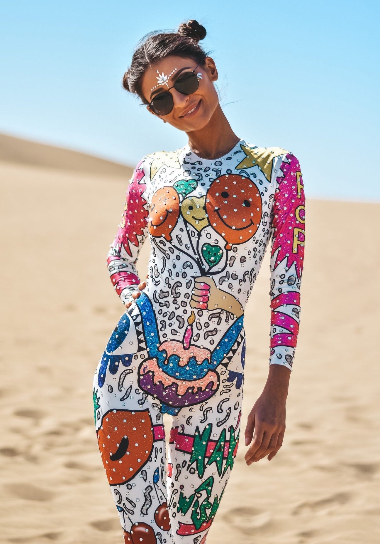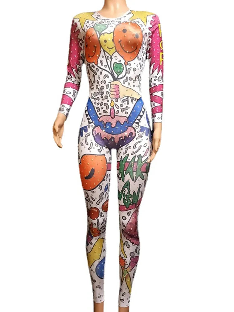 El Party Pop Queen Jumpsuit combina el poder escénico de los strass relucientes, el toque juguetón de los globos cartoon multicolor y una silueta que abraza tu cuerpo como una segunda piel cósmica.