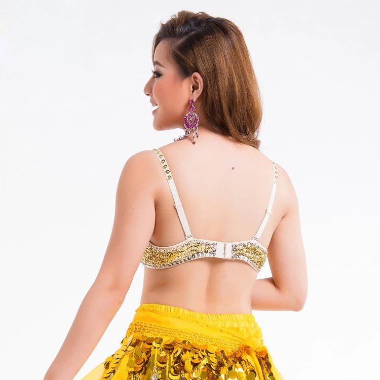 Deslumbra con este top estilo danza del vientre, con lentejuelas doradas, abalorios colgantes y diseño ajustable. Perfecto para espectáculos, fiestas temáticas o ese look que rompe la pista. ¡Movimiento y brillo en uno solo!