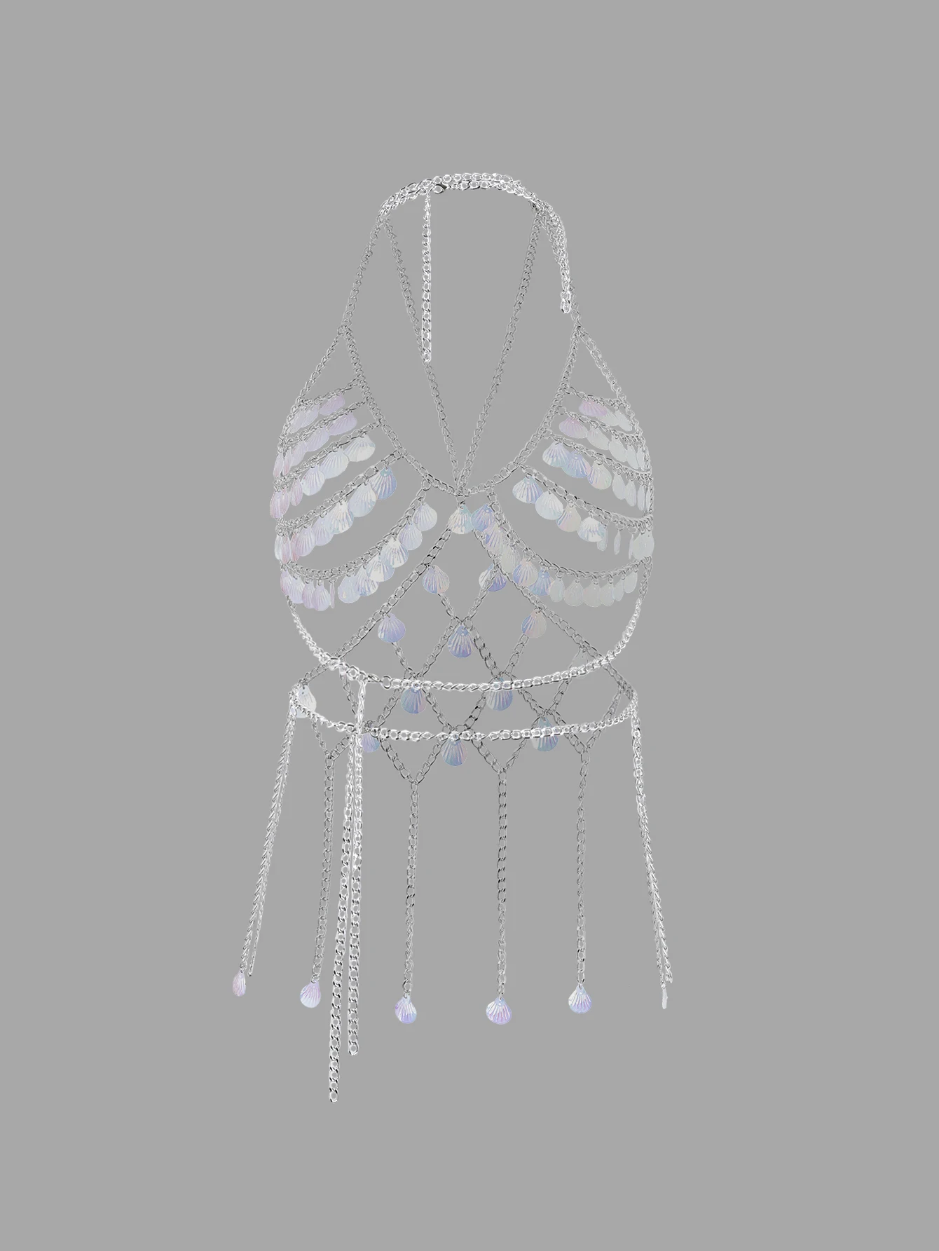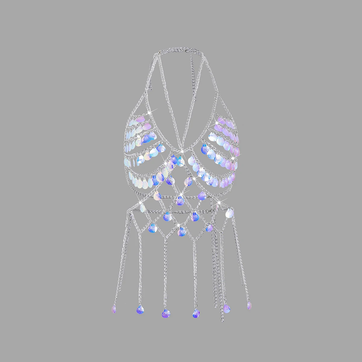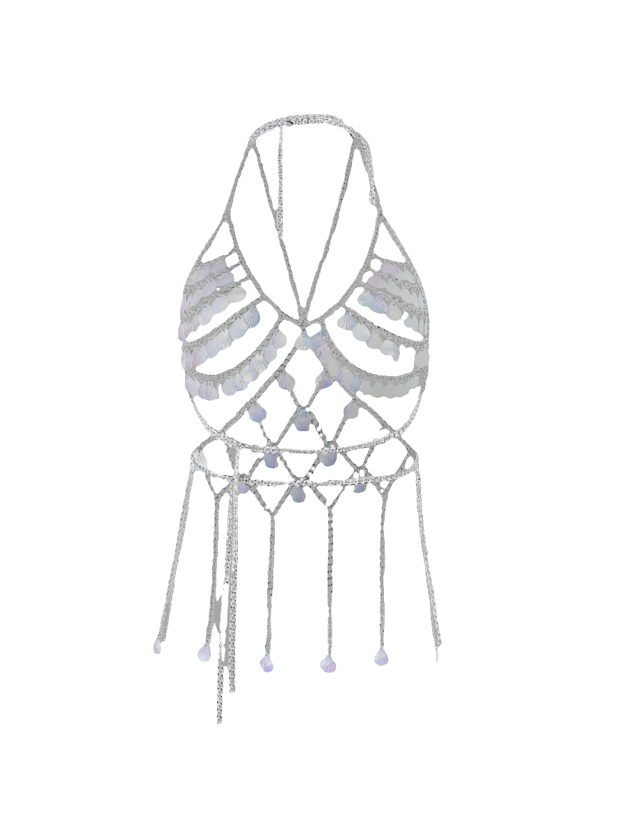 Este sujetador joya es una fantasía hecha realidad. Está confeccionado con cadenas plateadas y conchas brillantes que simulan el efecto tornasolado del nácar —como si hubieras salido directamente de una rave submarina. Cada movimiento tuyo lo convierte en un espectáculo de luz y sensualidad.