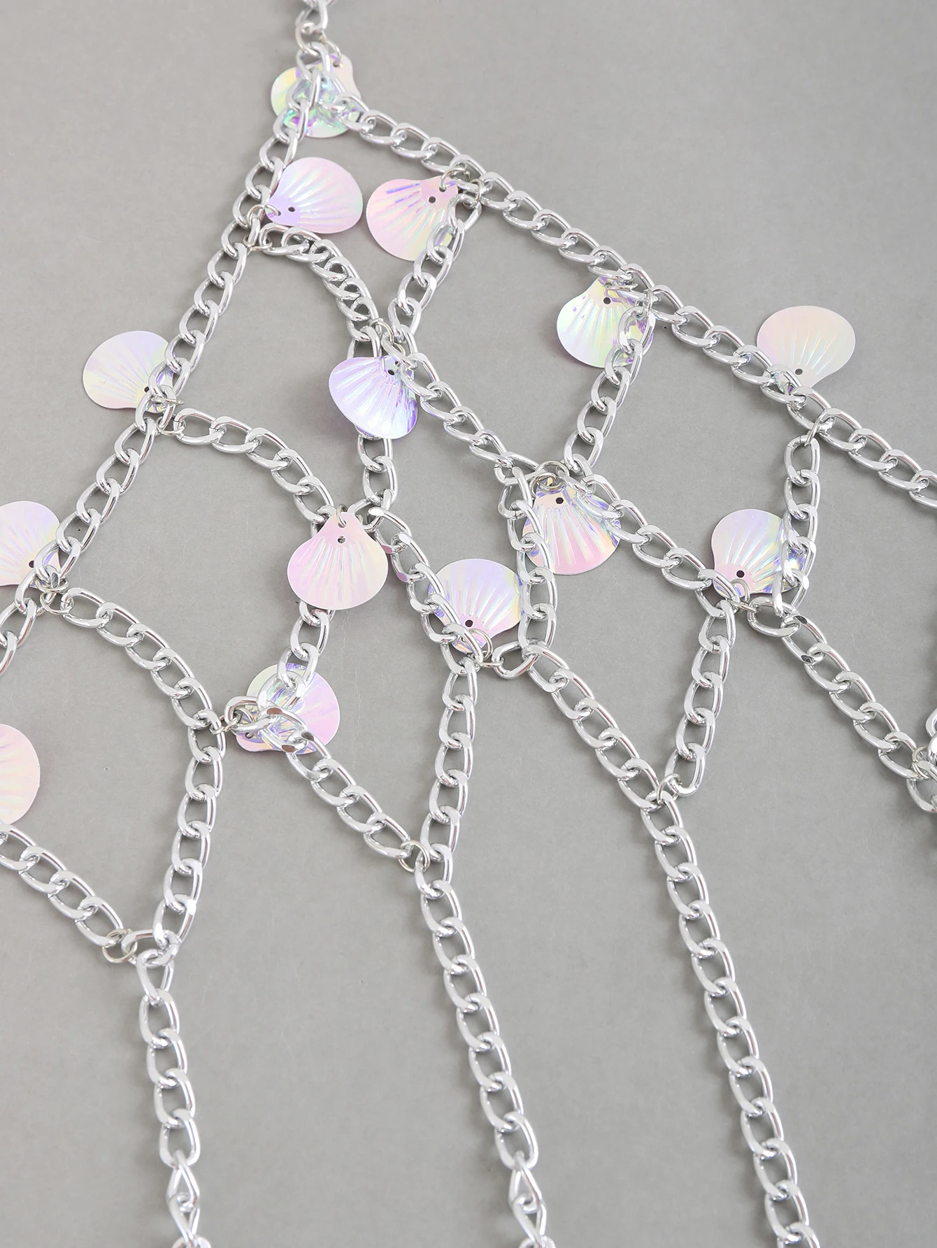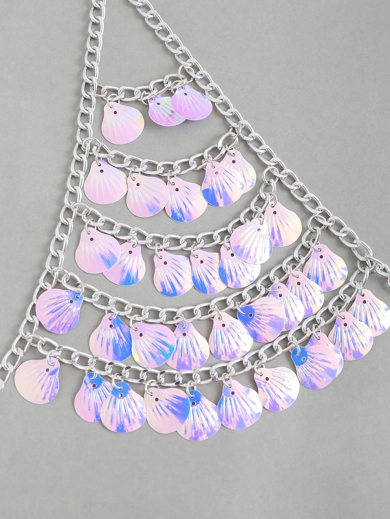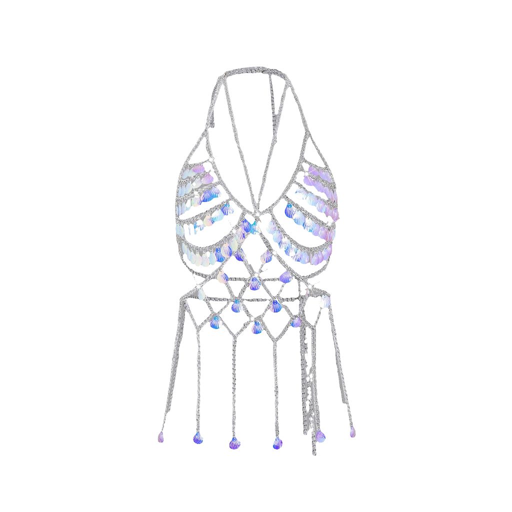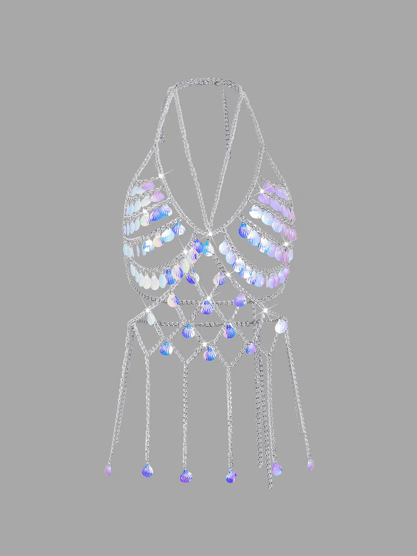 Este sujetador joya es una fantasía hecha realidad. Está confeccionado con cadenas plateadas y conchas brillantes que simulan el efecto tornasolado del nácar —como si hubieras salido directamente de una rave submarina. Cada movimiento tuyo lo convierte en un espectáculo de luz y sensualidad.