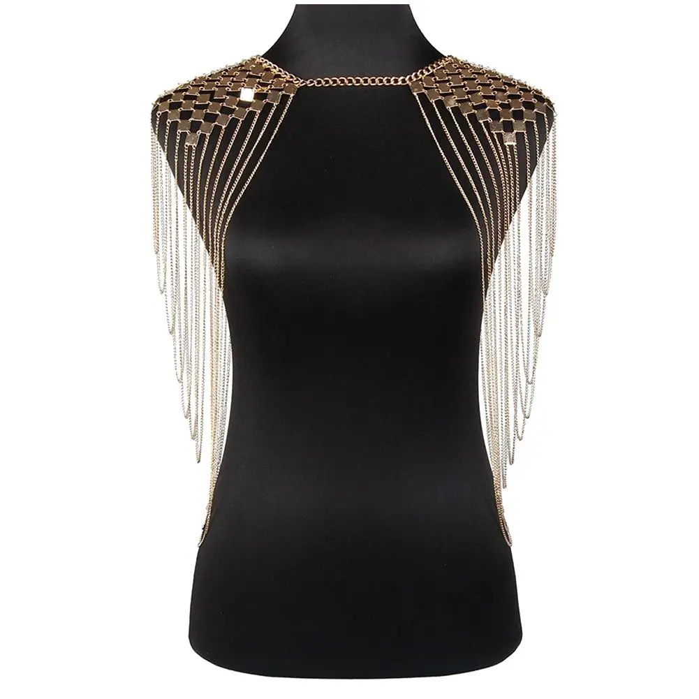 Este harness estilo punk vintage envuelve tus hombros, pecho y espalda con cadenas que caen como lluvia metálica.
