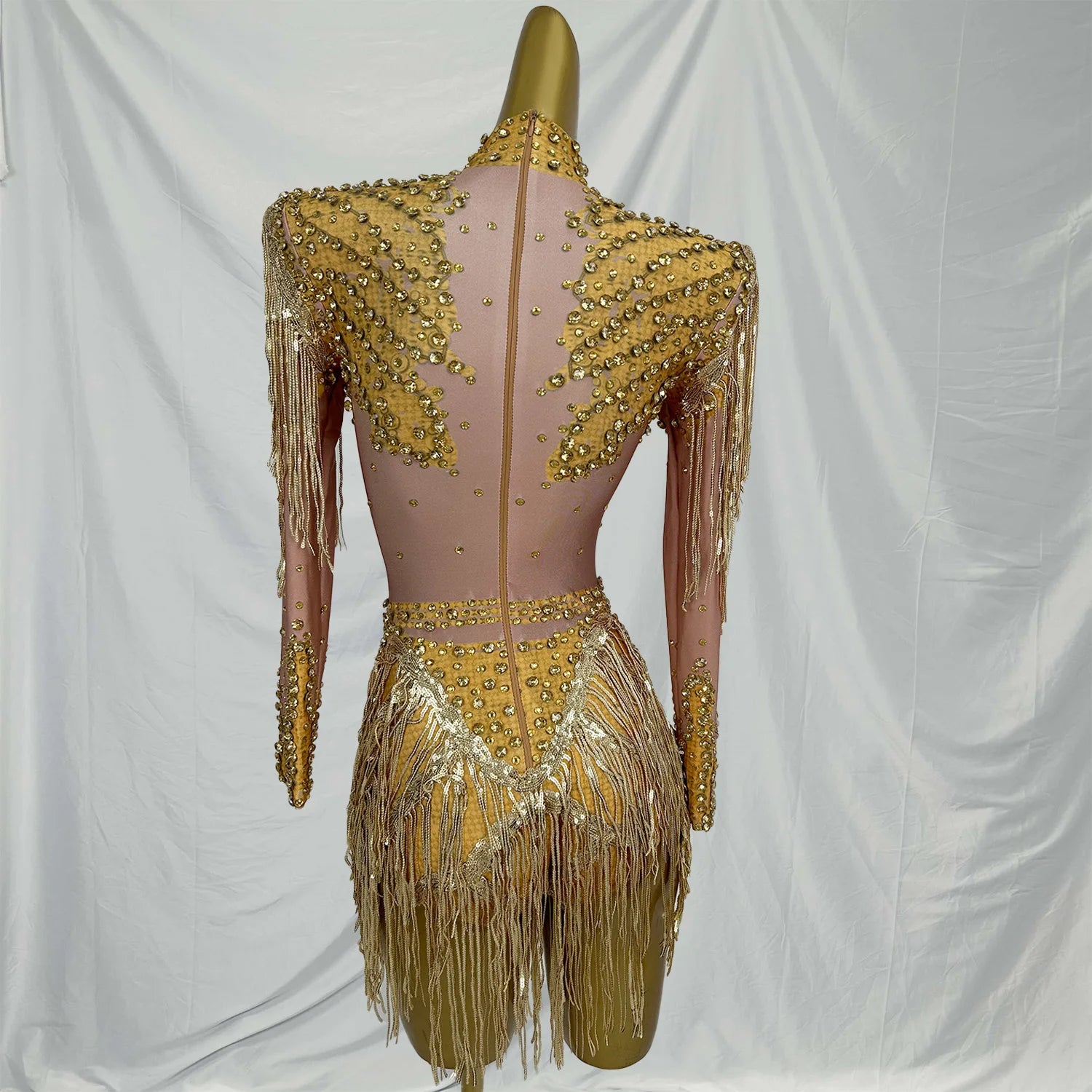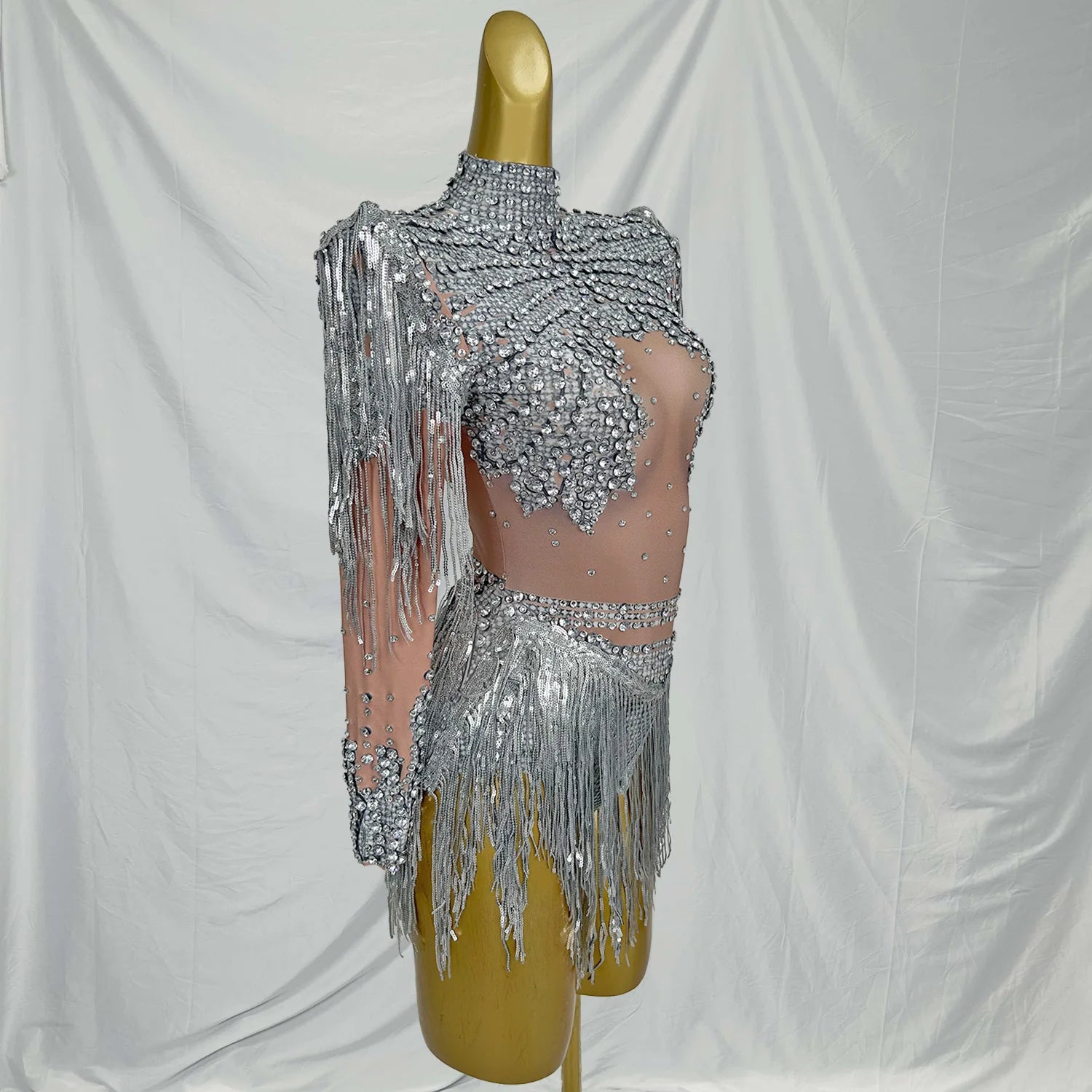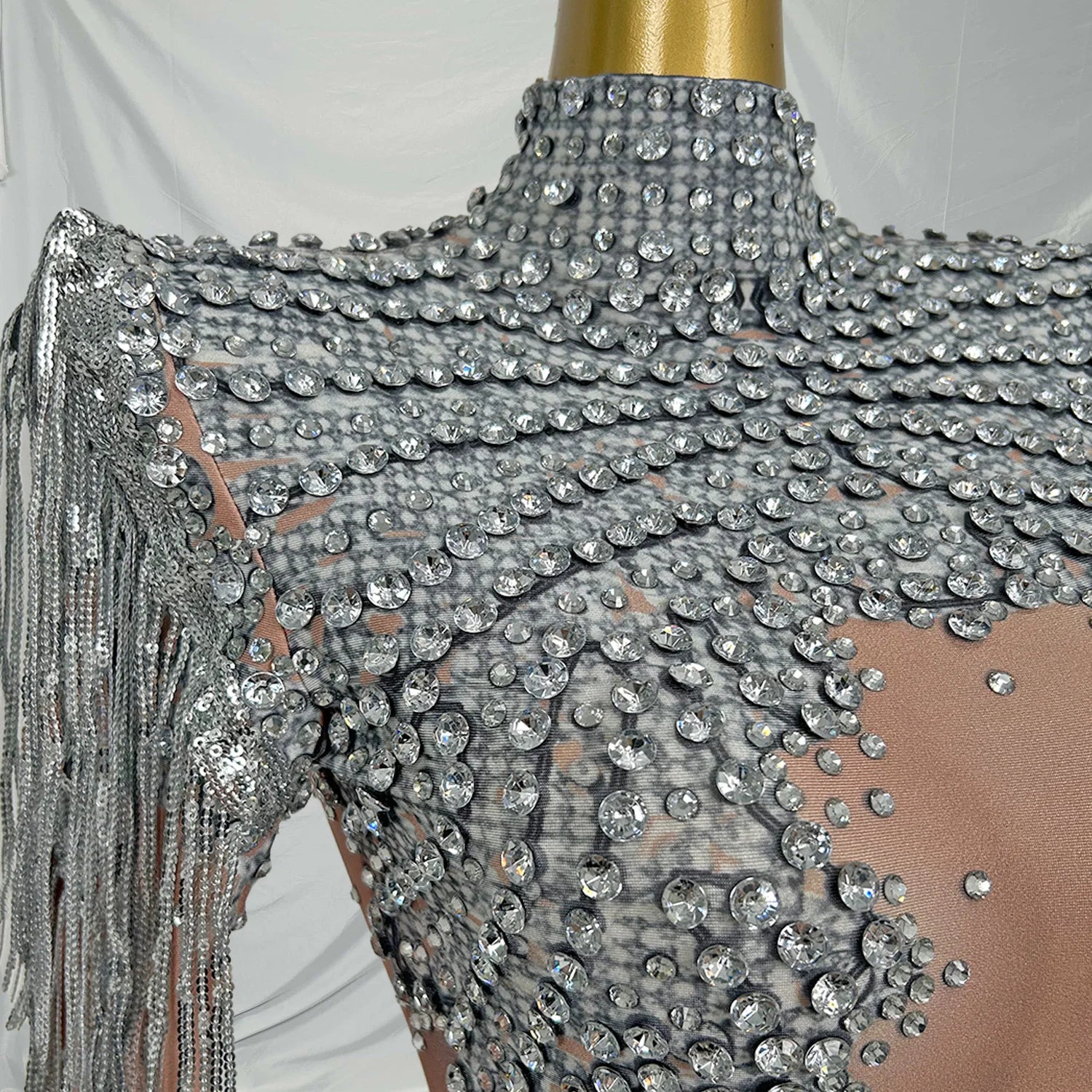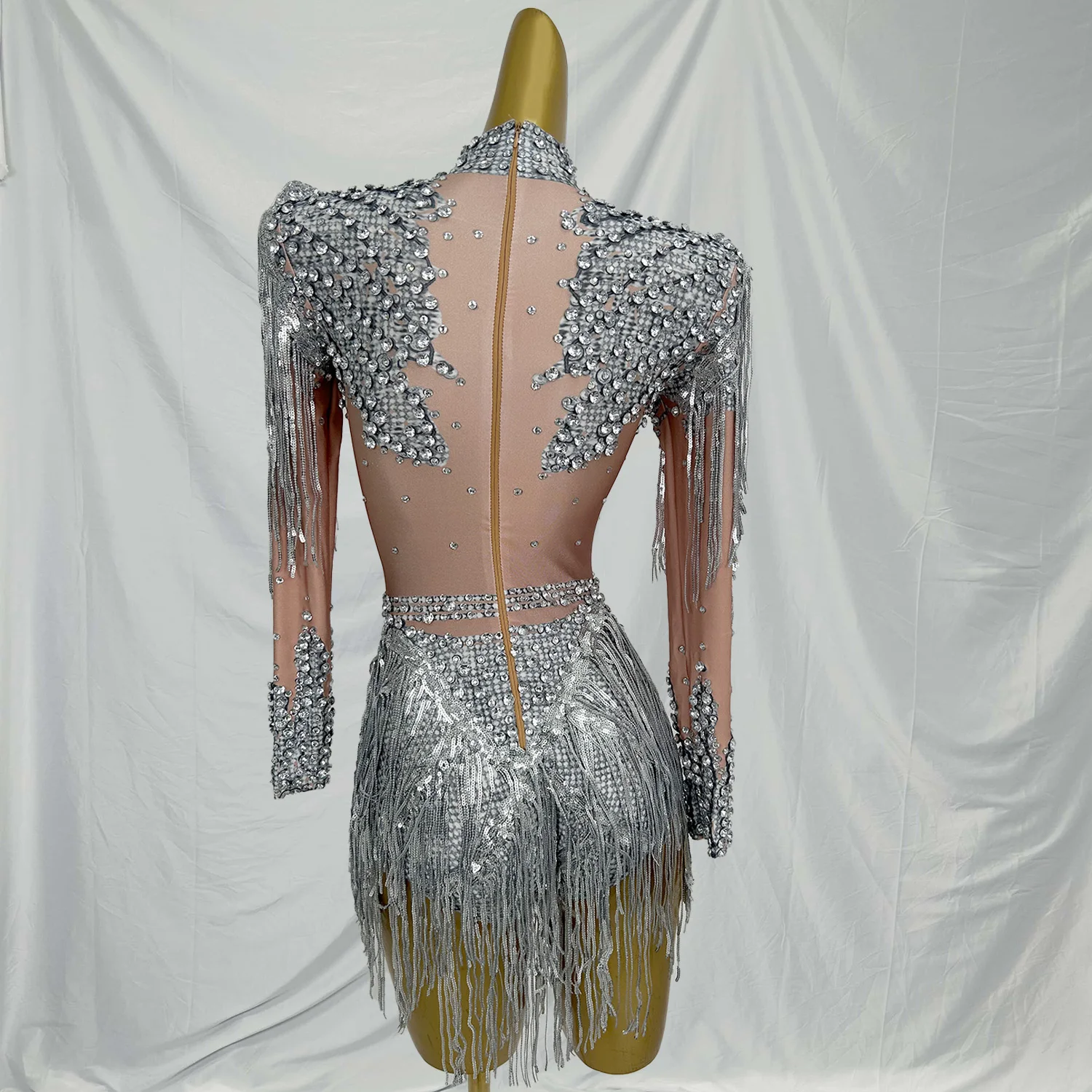 Este conjunto de body de red con diamantes y flecos largos está hecho para diosas del ritmo. El diseño transparente con brillo total realza tu figura y vibra con cada paso.