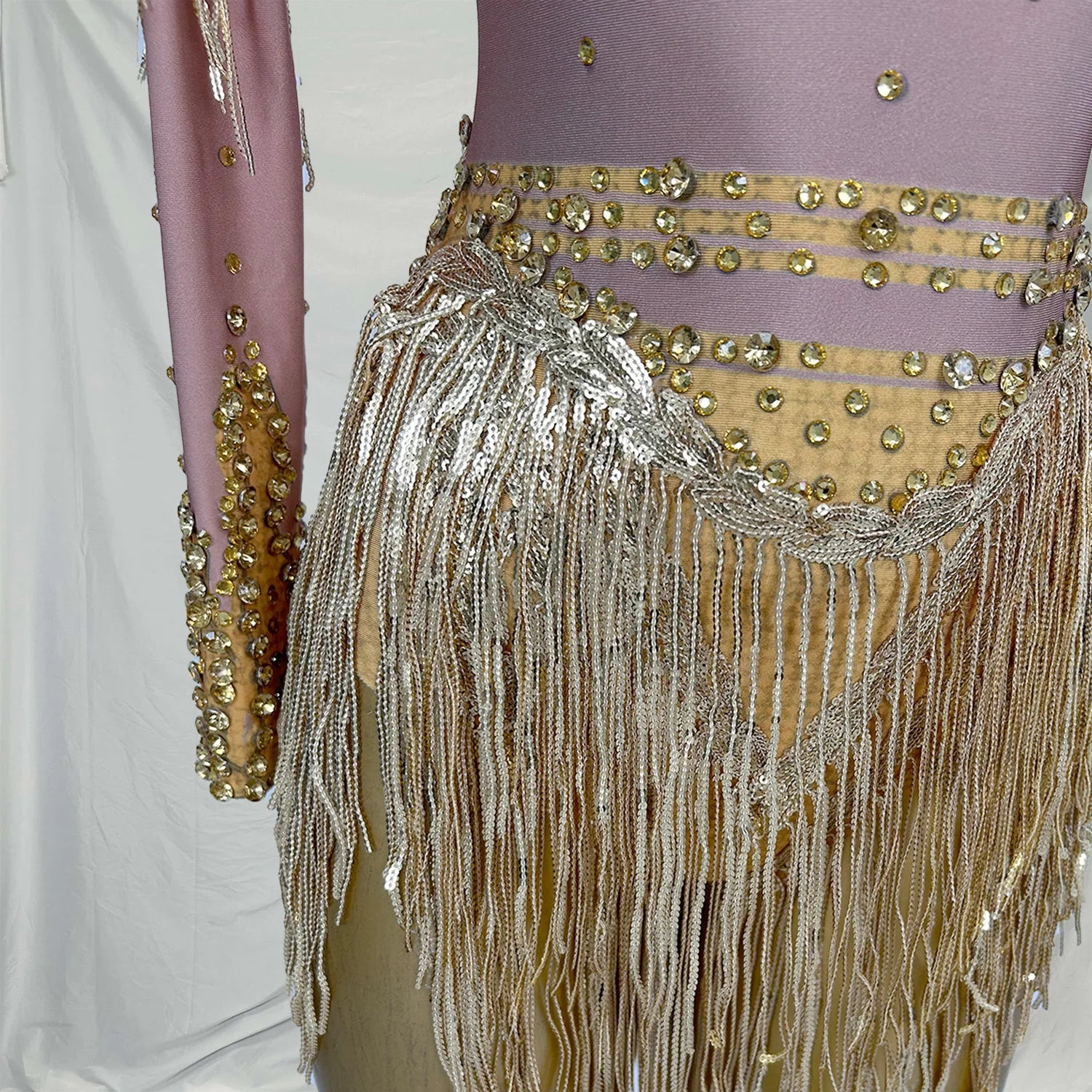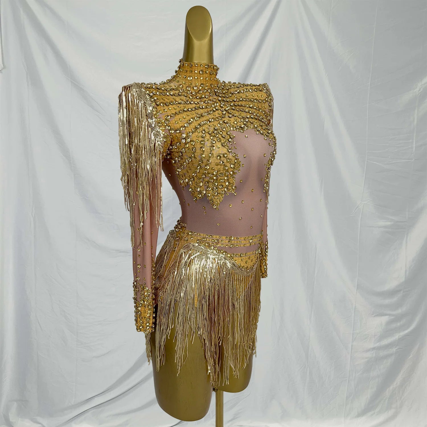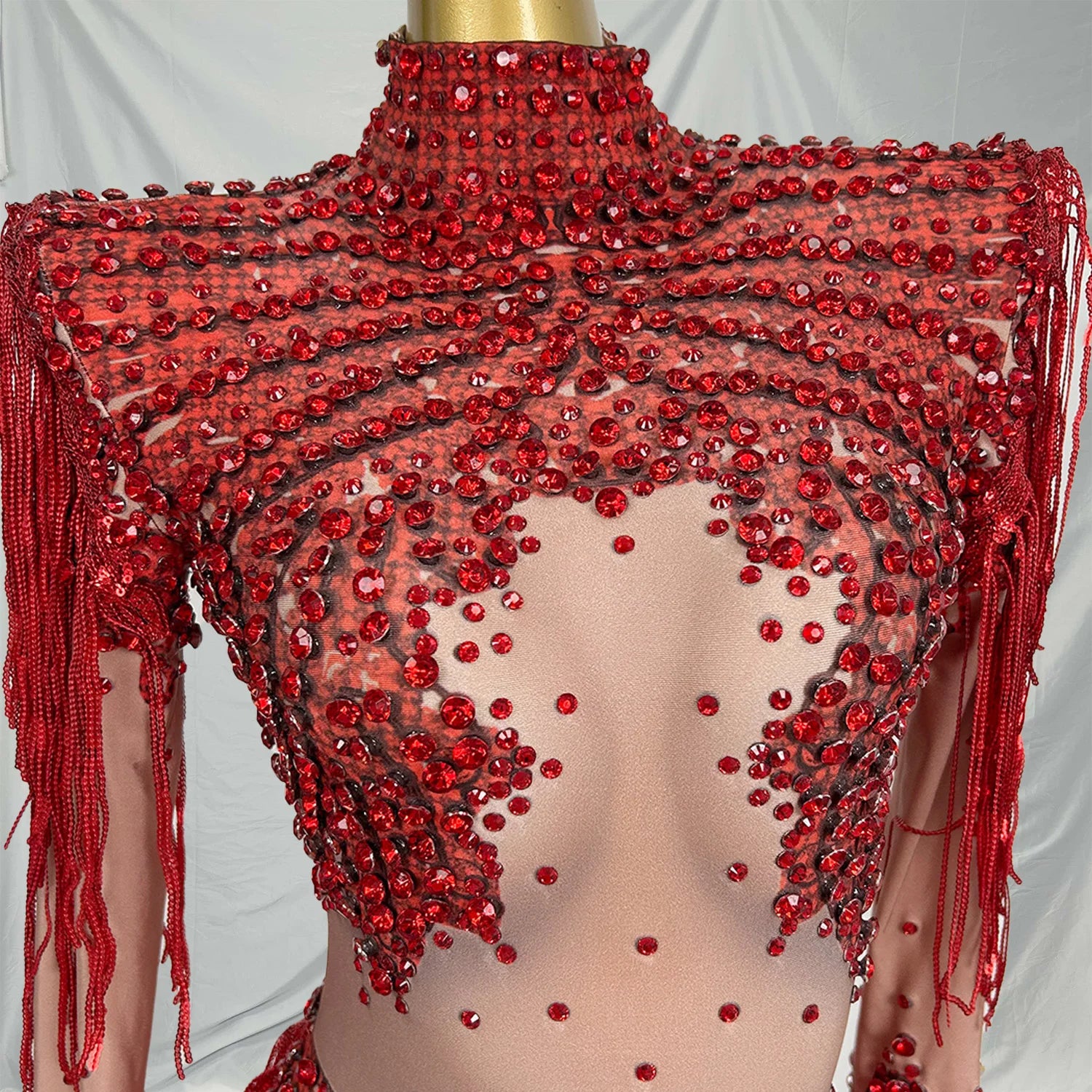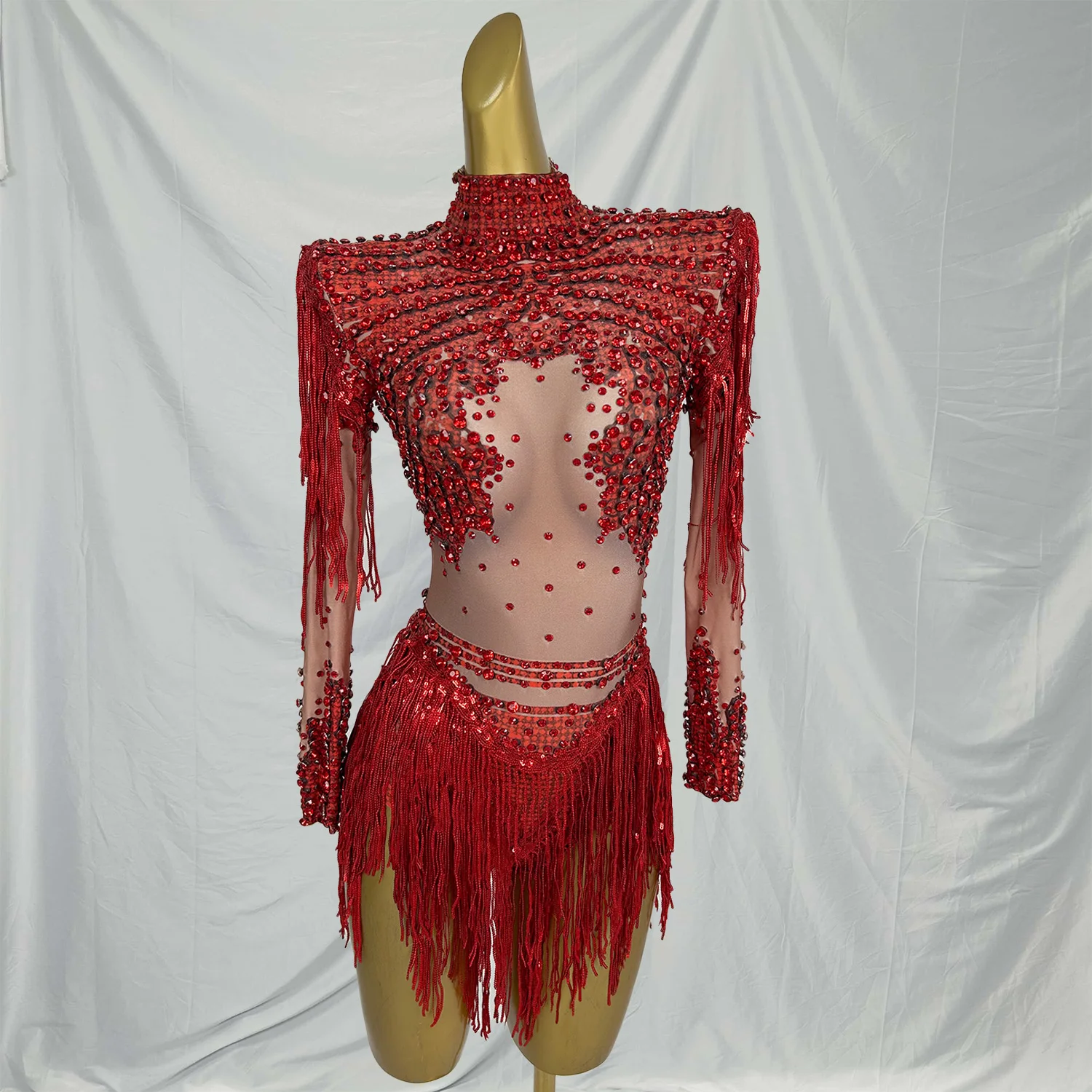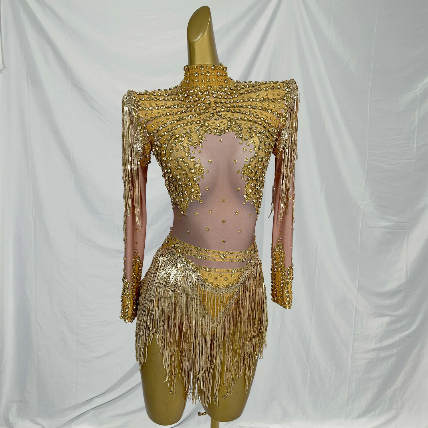 Este conjunto de body de red con diamantes y flecos largos está hecho para diosas del ritmo. El diseño transparente con brillo total realza tu figura y vibra con cada paso.