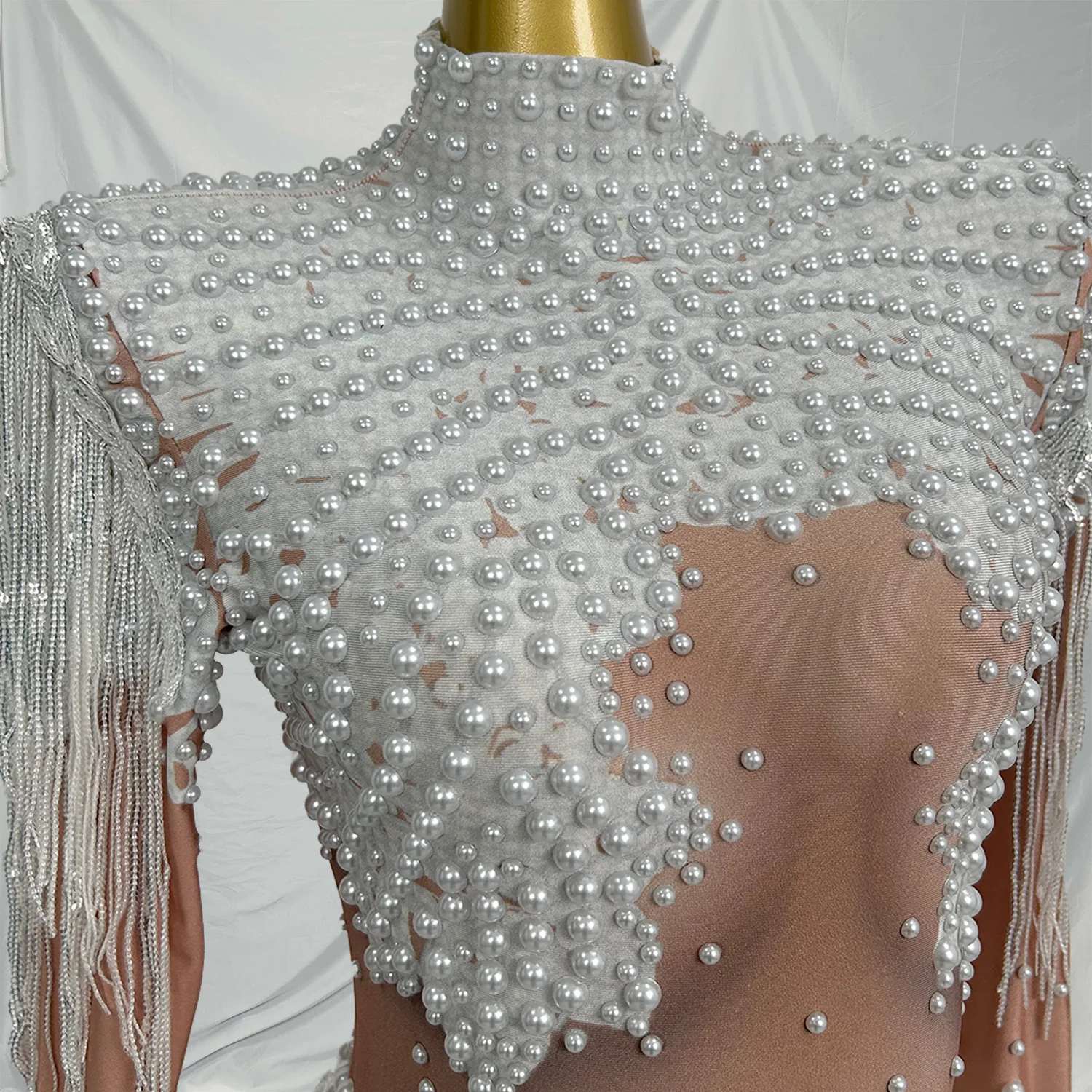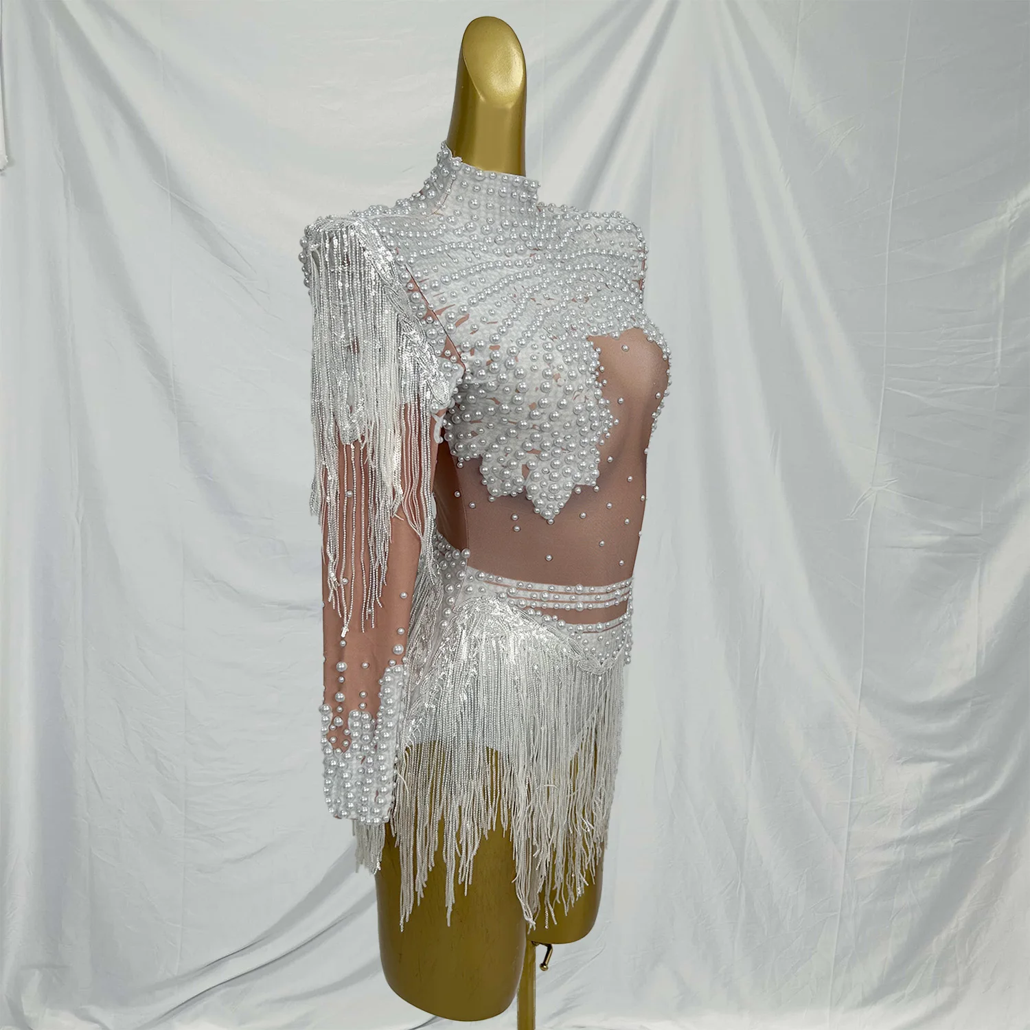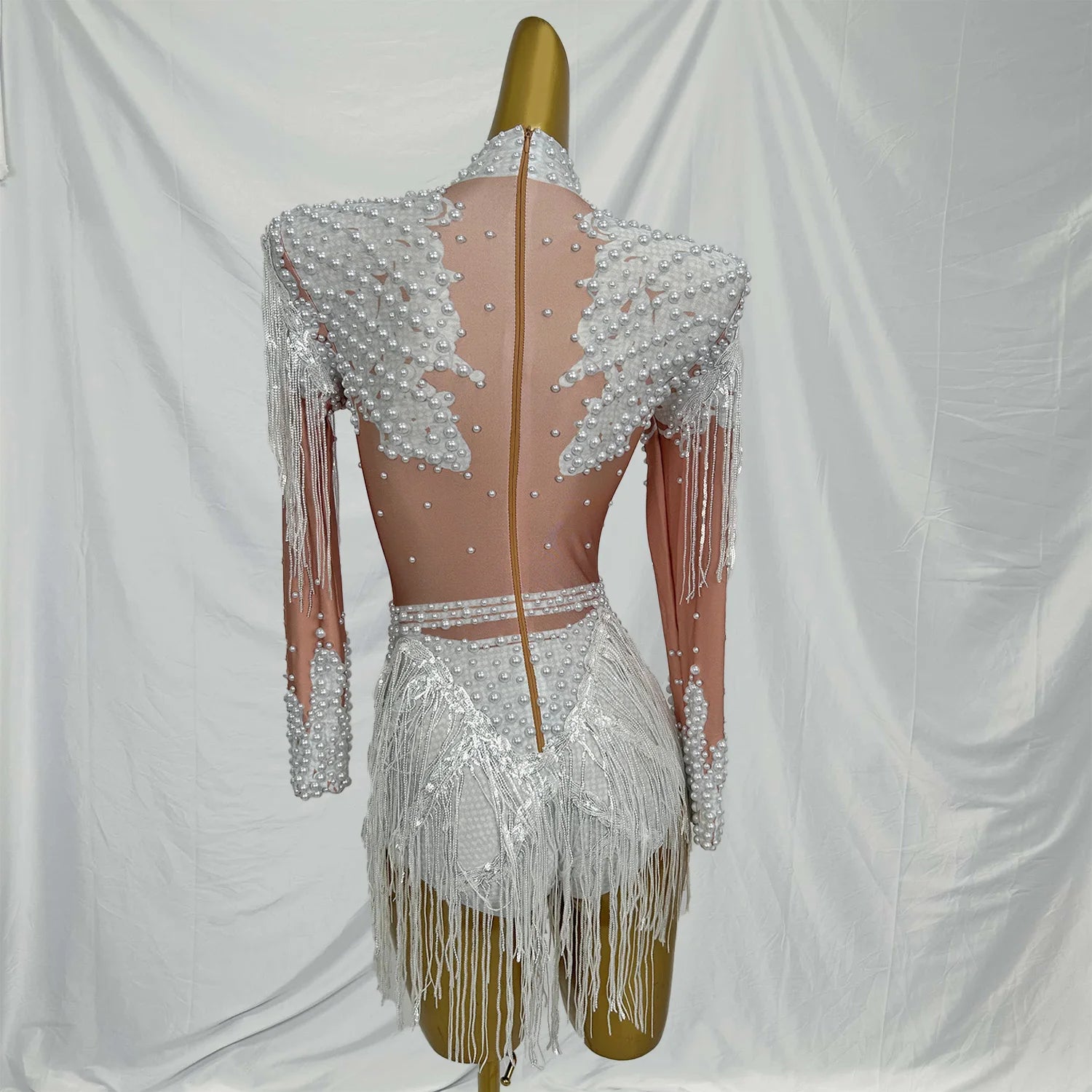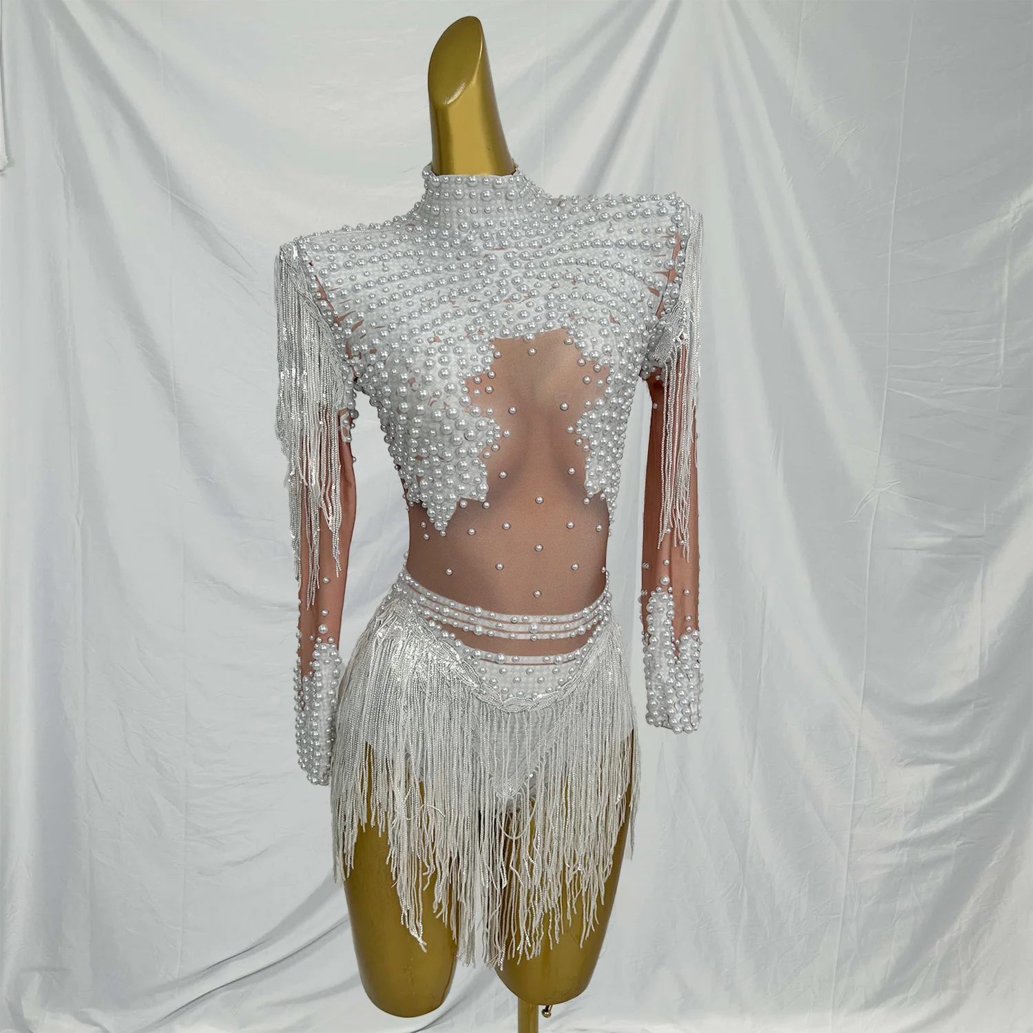 Este conjunto de body de red con diamantes y flecos largos está hecho para diosas del ritmo. El diseño transparente con brillo total realza tu figura y vibra con cada paso.